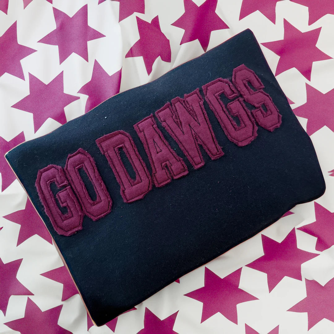 Gildan unisex fit sweatshirt used with sweatshirt material embroidered and raw cut appliqué. Appliqué color choices are same as the sweatshirt colors.