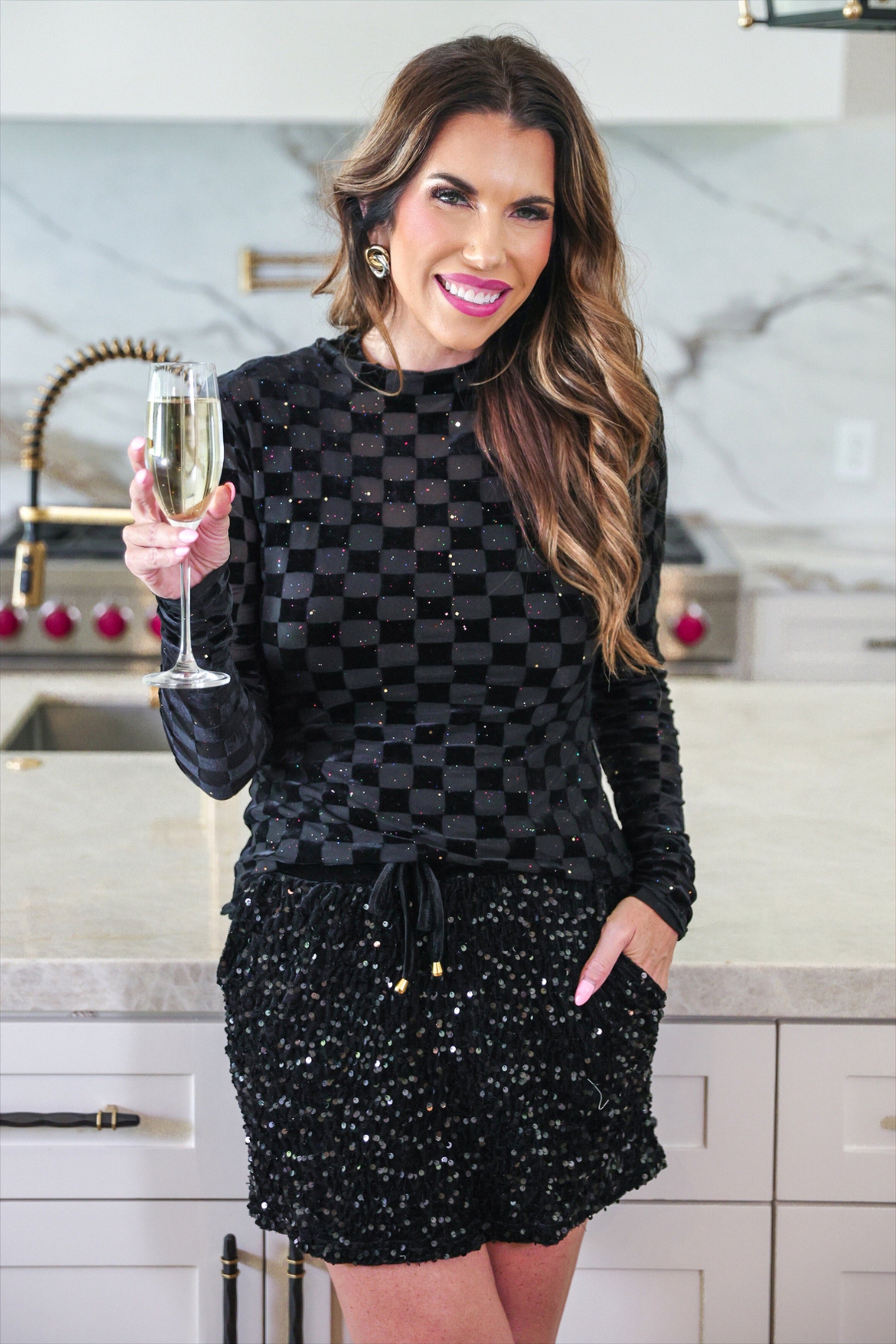 Enhance your wardrobe with the Times Square Velvet Mesh Top in Black Checkered. Featuring delicate lettuce-edge hems, a stylish mock neck, glitter accents, a blend of sheer mesh and velvet checkered fabric, this versatile top is perfect for layering or wearing alone. Elevate your seasonal outfits and shine with effortless glamour in this essential piece!