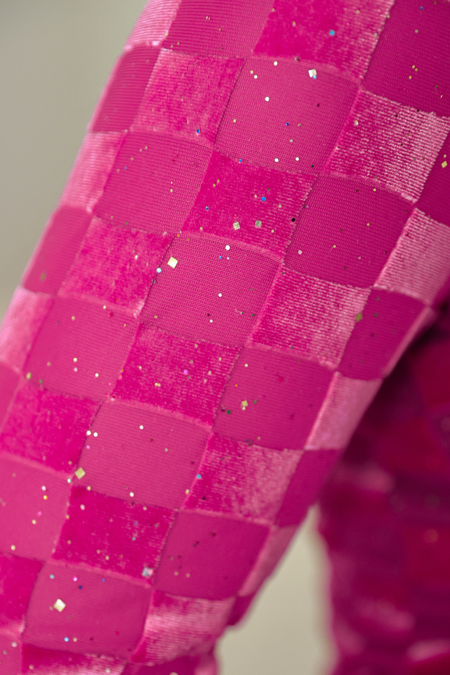 Enhance your wardrobe with the Times Square Velvet Mesh Top in Pink Checkered. Featuring delicate lettuce-edge hems, a stylish mock neck, glitter accents, a blend of sheer mesh and velvet checkered fabric, this versatile top is perfect for layering or wearing alone. Elevate your seasonal outfits and shine with effortless glamour in this essential piece!